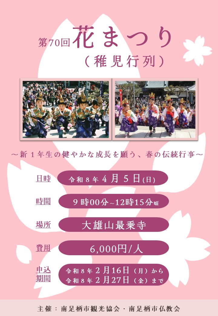 9時00分 受付(大雄山最乗寺)、着付け 10時00分 稚児行列(※雨天の場合は屋内にて行列を行います。) 10時10分 主催者、来賓あいさつ 10時30分 記念写真撮影 10時50分 灌仏会 11時35分 衣装返却(記念品の配布) 12時15分 解散 |