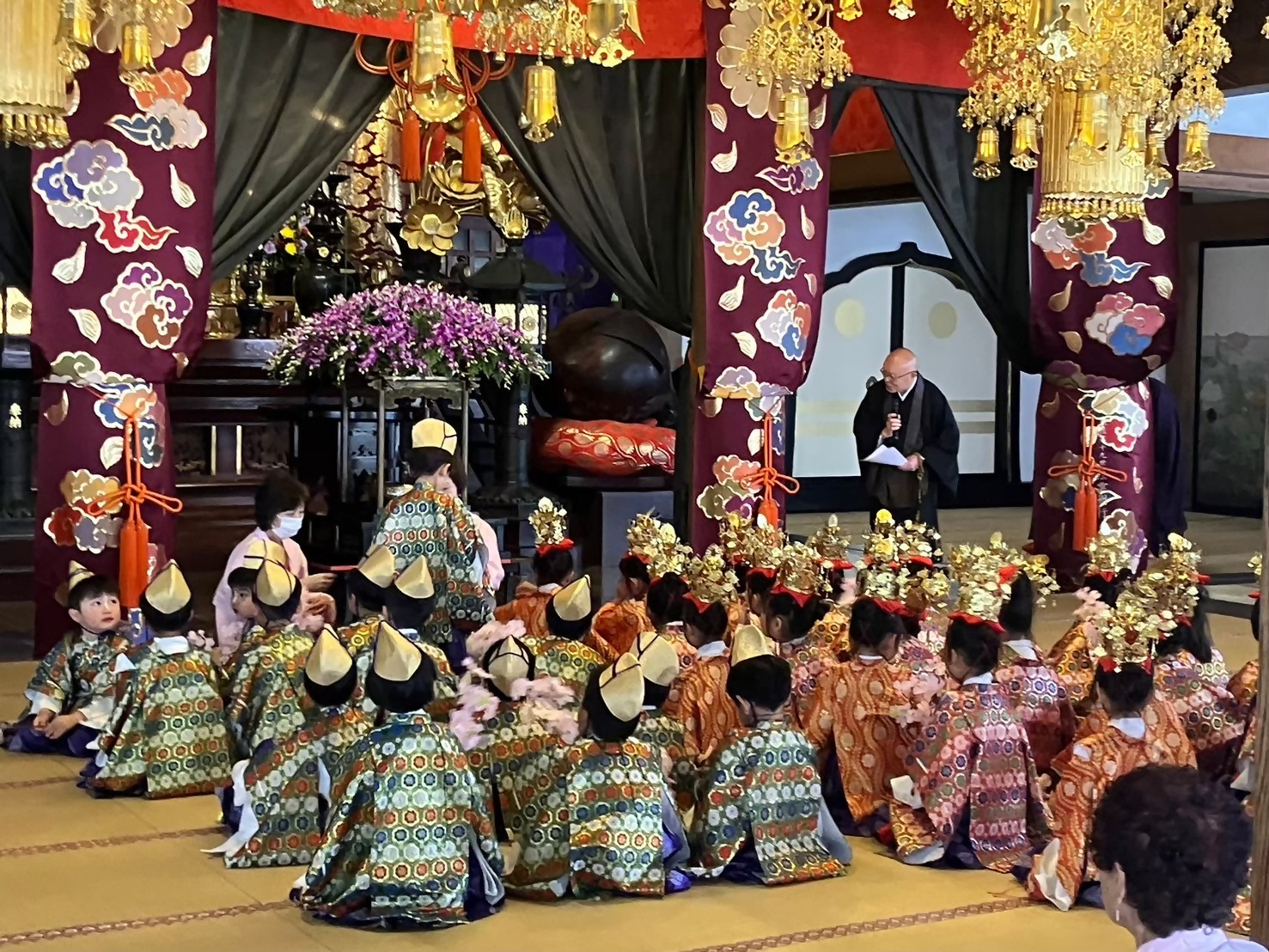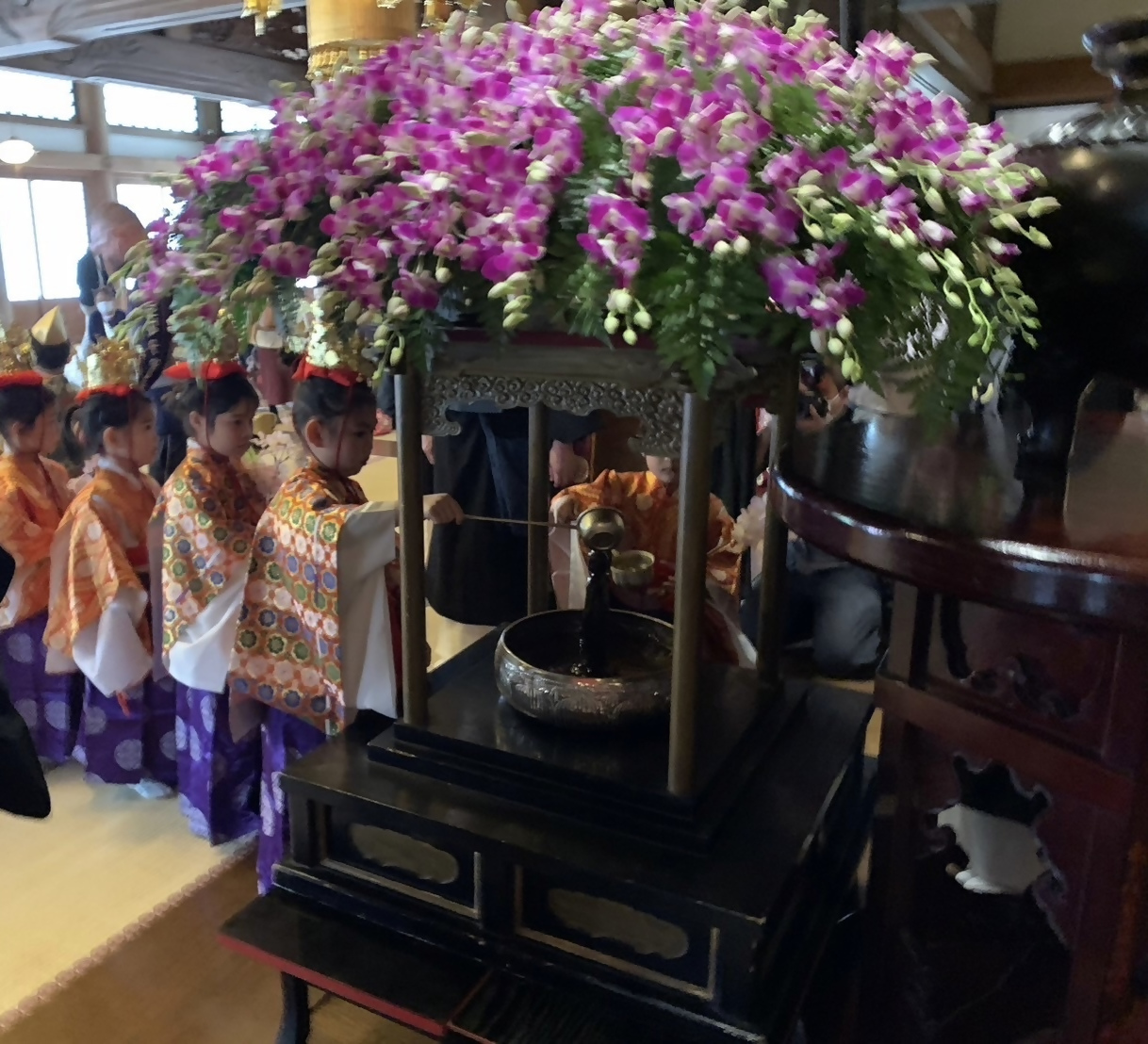 境内を練り歩く稚児行列の後は、お釈迦様の誕生を祝う仏教行事である灌仏会を本堂にて行います。